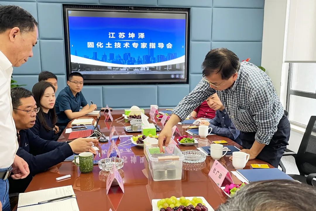 2022年4月12日江苏坤泽固化土技术专家指导会召开,东南大学教授刘松玉、杜广印、邓永锋,南京工业大学教授韩爱民,江苏省地震局博士于昕和南京东大建设新技术有限公司总经理范越宇等一行专家领导应邀出席。
